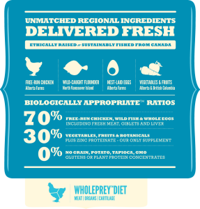 עוף טרי (16%), בשר עוף מיובש (13%), בשר הודו מיובש (12%), עדשים אדומות, אפונה ירוקה, טפלי עוף (כבדים, לבבות וכליות)(7%), שומן עוף (7%), ביצים (4%), דג סנדל טרי (4%), בשר הרינג מיובש (3%), שמן הרינג (2%), אלפלפא מיובשת, עדשים ירוקות, שעועית, אפונה צהובה, סיבי אפונה, סחוס עוף טרי (2%), אצות ים, דלעת, דלורית, גזר לבן, כרוב עלים, תרד, עלי חרדל, עלי לפת, גזר, תפוחים, אגסים, כבד עוף מיובש בהקפאה, כבד הודו מיובש בהקפאה, חמוציות, אוכמניות, שורש עולש, כורכום, גדילן מצוי, שורש דקורית, לבנדר, שורש מרשמלו, פקעות ורדים, אבץ, פרה-ביוטיקה.
